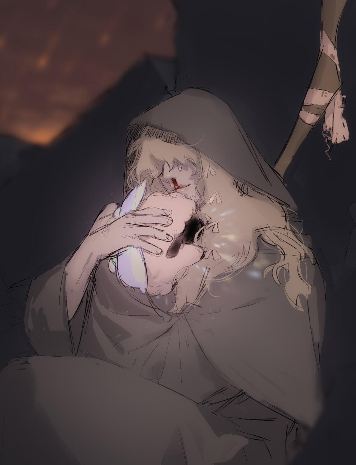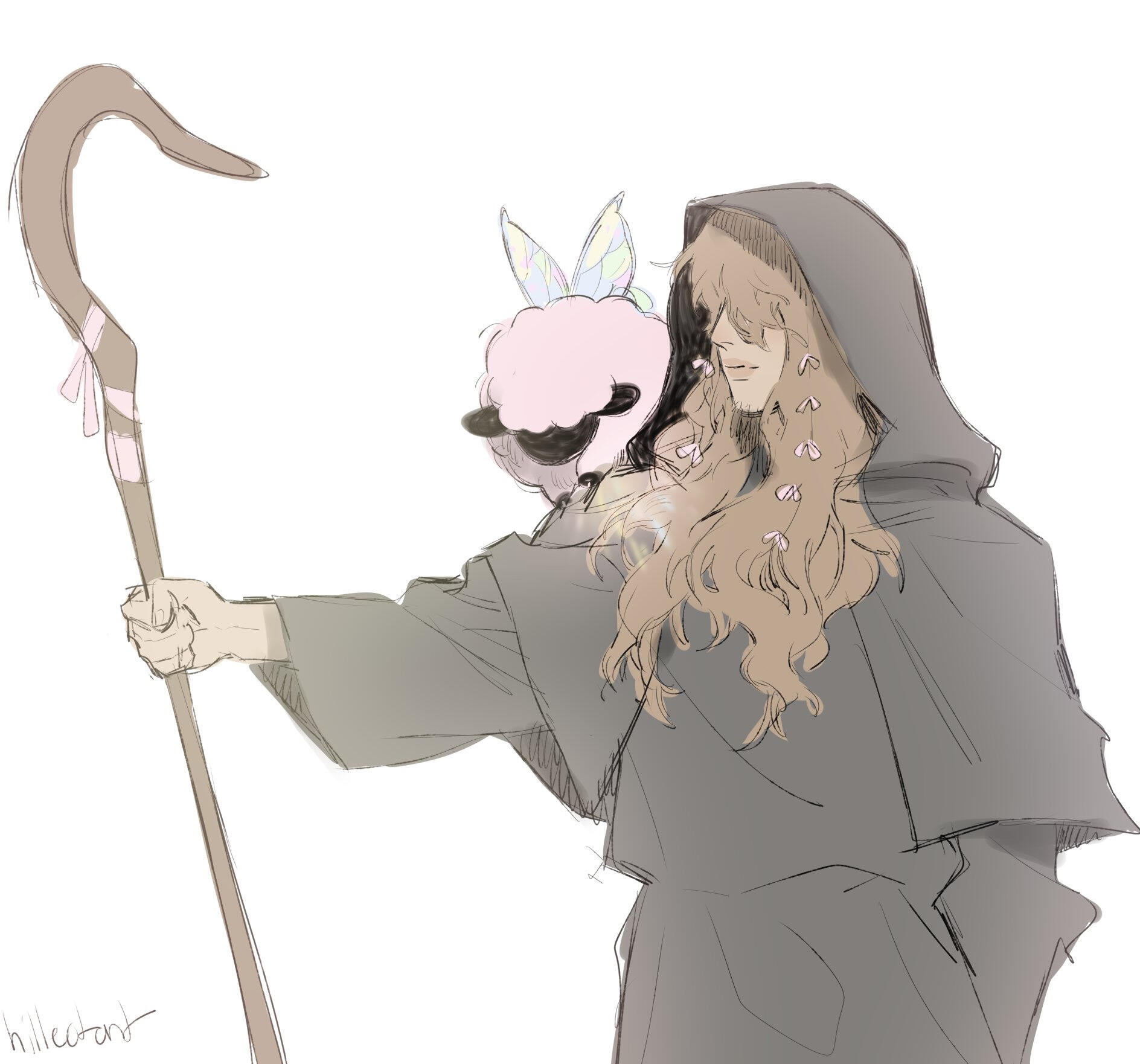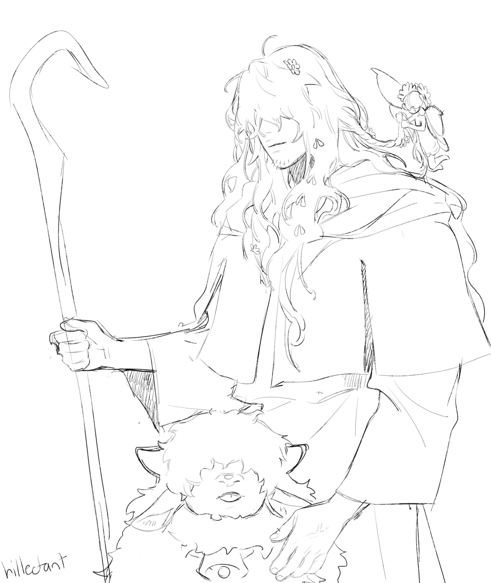 Height: taller than the average ancientBefore the Sundering of the Star, when his soul was yet intact in a single whole, Menoetes lived as a kindly giant wandering peacefully across the expansive world of Etheirys with little companionship but his own creations - but he would have it no other way. While intentions may differ across shards, Bran’s antisocial tendencies reach back to these times immemorial, inscribed into the very bark of his soul.While Menoetes made no attempt to direct kindness away from his fellow man, his attention always lied with his singular but proudest concepts; a species of wool-bearing animals of a peaceful, herding nature. When his concept was approved by the Bureau and passed testing in Elpis, he found himself overjoyed - and then overwrought with concern for the creatures.He took to accompanying them across their grazing pastures as a shepherd, keeping a watchful eye on them lest they be attacked and devoured by greater beasts before they would be able to breed a sufficient gene pool. Quickly, though, he found that the company of sheep could be a very lonely one, for regardless of how unconditionally he adored the creatures, conversation became less a desire and more a neglected necessity.Considering a severe case of agoraphobia, he did not see it necessary to seek out other humans to speak with. Instead, he fashioned a familiar for himself, similar in design to his beloved sheep but capable of both bridging the gap between his thoughts and theirs and acting as a separate conversation partner all on their own. They were named Persephone and over their many years together, he came to consider them his dearest companion.The Final Days arrived with little warning. Uprooted from his life as a lonely shepherd, forced to flee to safer ground to protect himself and his familiar friend, Meneotes experienced the very final moments of their intact world with his companion in his arms. Realizing that concepts were being turned by the fear and pain of the people around them, he sought a quiet corner to spend those moments together, intending to set free his friend’s aether before they, too, could be corrupted.It would not be so, though. Before he could send Persephone’s aether on it’s peaceful return to the Star, the world itself was rent from under his feet. He was separated from his companion, knowing only loss before his soul was shattered into fourteenths.